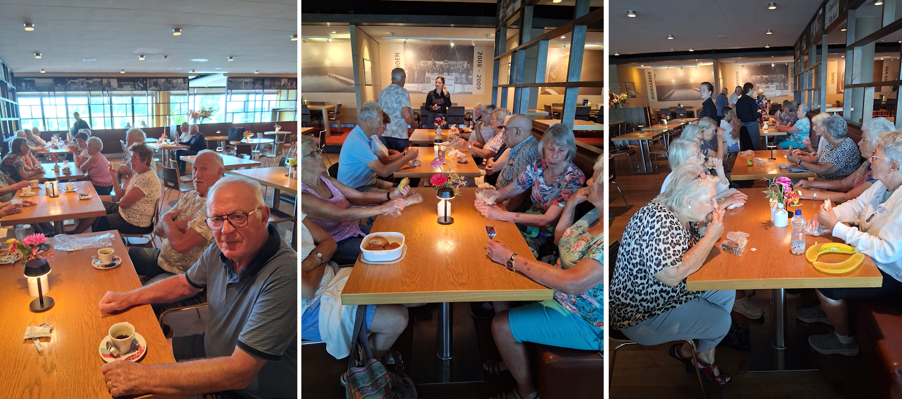 Hier werden we opgewacht door Jeroen Wester die ons gastvrij ontving. Hij vertelde over zijn bezigheden in het stadion. Eerst kregen we uitleg in een zaal voor fysiotherapie van Sport Performans, zij helpen cliënten met hun blessures dmv een speciale warmte filmcamera. Jeroen leidde ons naar een kantoor waar mensen werkplekken konden huren. Daar waren geen vragen over. Toen naar boven, naar de sky-box bovenin het stadion vanwaaruit je een prachtig zicht hebt op de wedstrijden. Even waarden we ons belangrijke gasten.Na de bezichtiging, tijd om naar de Brasserie te gaan voor de lunch. Mooie plek om effe bij te kletsen onder het genot van koffie, thee of cappuccino. Ieder vertelde over zijn/haar indrukken die waren opgedaan.Om half 2 stapten we weer op de fiets. Via de Vondelstraat beklommen we de Friese brug, over de Friese weg naar Molenkade, dan over het Achtergeestpad naar Sint Pancras waar we stopten om afscheid te nemen van elkaar. Het was weer een leuke fietstocht geweest én ieder kwam weer veilig thuis.